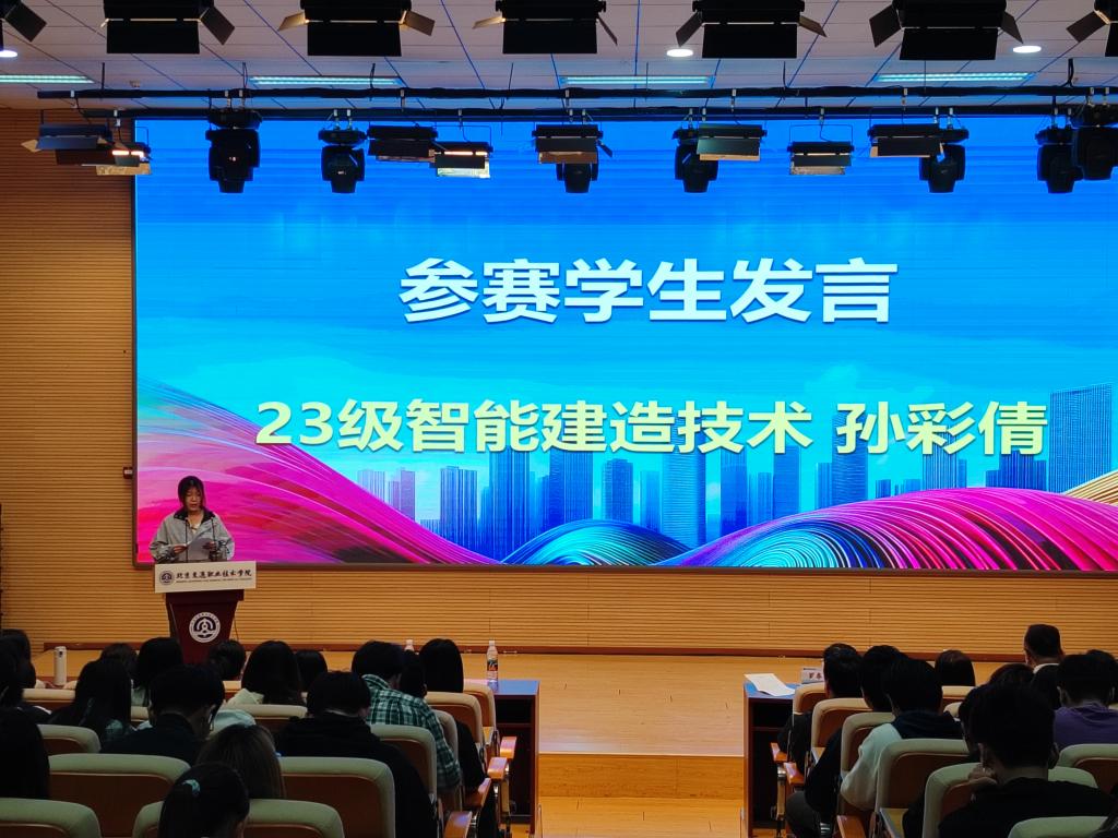 23級智能建造技術專業的孫彩倩同學作為參賽學生代表進行發言。她堅定地表示:"成長沒有捷徑,唯有在荊棘叢生的奮斗征程中直面困境、突破自我設限的邊界,才能蛻變出更加堅韌的閃光人格。"全體參賽學生將以主人翁姿態主動迎接賽事挑戰,以昂揚的精神狀態投入比賽,在突破自我的過程中淬煉品格,用無畏的勇氣詮釋工匠精神。