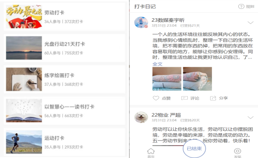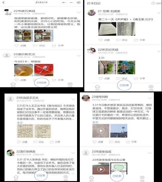 活動(dòng)包括:同以體強(qiáng)心——運(yùn)動(dòng)打卡、以美潤(rùn)心——書畫打卡、以智慧心——閱讀打卡、以德育心——光盤打卡、以勞健心——?jiǎng)趧?dòng)打卡。我院共計(jì)355人次參與打卡,其中25人堅(jiān)持21天全程打卡,64.2%的同學(xué)堅(jiān)持16天以上,累計(jì)打卡2451條。