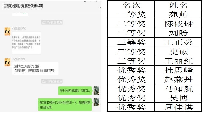 本次心理健康知識競賽活動方案一經推出,心理健康教育中心積極響應,高度重視,成立了線上趣味心理知識競賽微信群,集結40名選手共同備賽,共11名同學在本次競賽中獲得院級獎項。