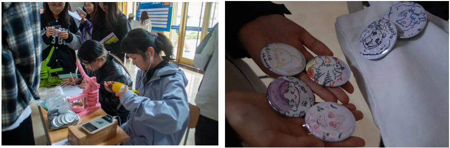 活動伊始,教一樓大廳便被濃厚的主題氛圍包裹。“人人享有心理健康服務”主題條幅早已擺放就位,過往同學紛紛駐足,在志愿者的引導下,鄭重地簽下自己的名字,以這種方式表達對心理健康服務普及的支持與期待。社團精心打造的活動照片墻展示了心理健康協會以往舉辦的各類特色活動,一張張生動的照片直觀地呈現了社團的活動特色與魅力,讓同學們清晰地了解到加入社團后能參與的豐富活動,不少同學在照片墻前駐足討論,對社團活動表現出濃厚興趣。創意徽章DIY 環節更是將現場氣氛推向高潮。社團為同學們準備了豐富的材料,包括各色徽章底托、顏料、貼紙等,同學們可以充分發揮自己的想象力和創造力,設計并制作屬于自己的主題徽章。有的同學繪制了可愛的卡通,有的同學寫下了鼓勵的話語,還有的同學用圖案展現了自己的心情。大家紛紛表示,把喜歡的圖案“戴”在身上,讓這枚小小的徽章成為了流動的溫暖符號,不僅極具紀念意義,還能時刻提醒自己關注心理健康。