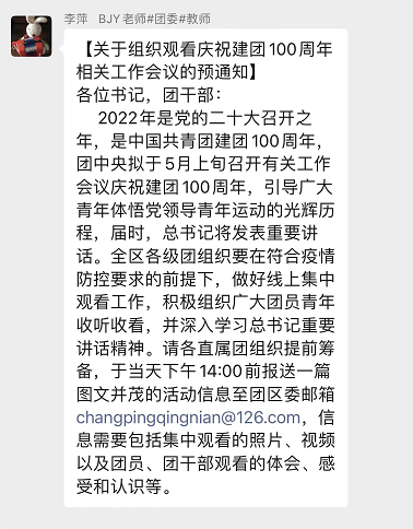 慶祝中國共產主義青年團成立100周年大會于2022年5月10日上午在北京人民大會堂隆重舉行,中共中央總書記、國家主席、中央軍委主席習近平同志出席大會并發表重要講話。北京交通職業技術學院青年師生熱切關注大會盛況,全院上下反響熱烈,院團委第一時間認真組織團員青年和學工系統教師通過多種形式收聽收看實況直播,回顧建團百年光輝歷程,展望新時代美好未來!