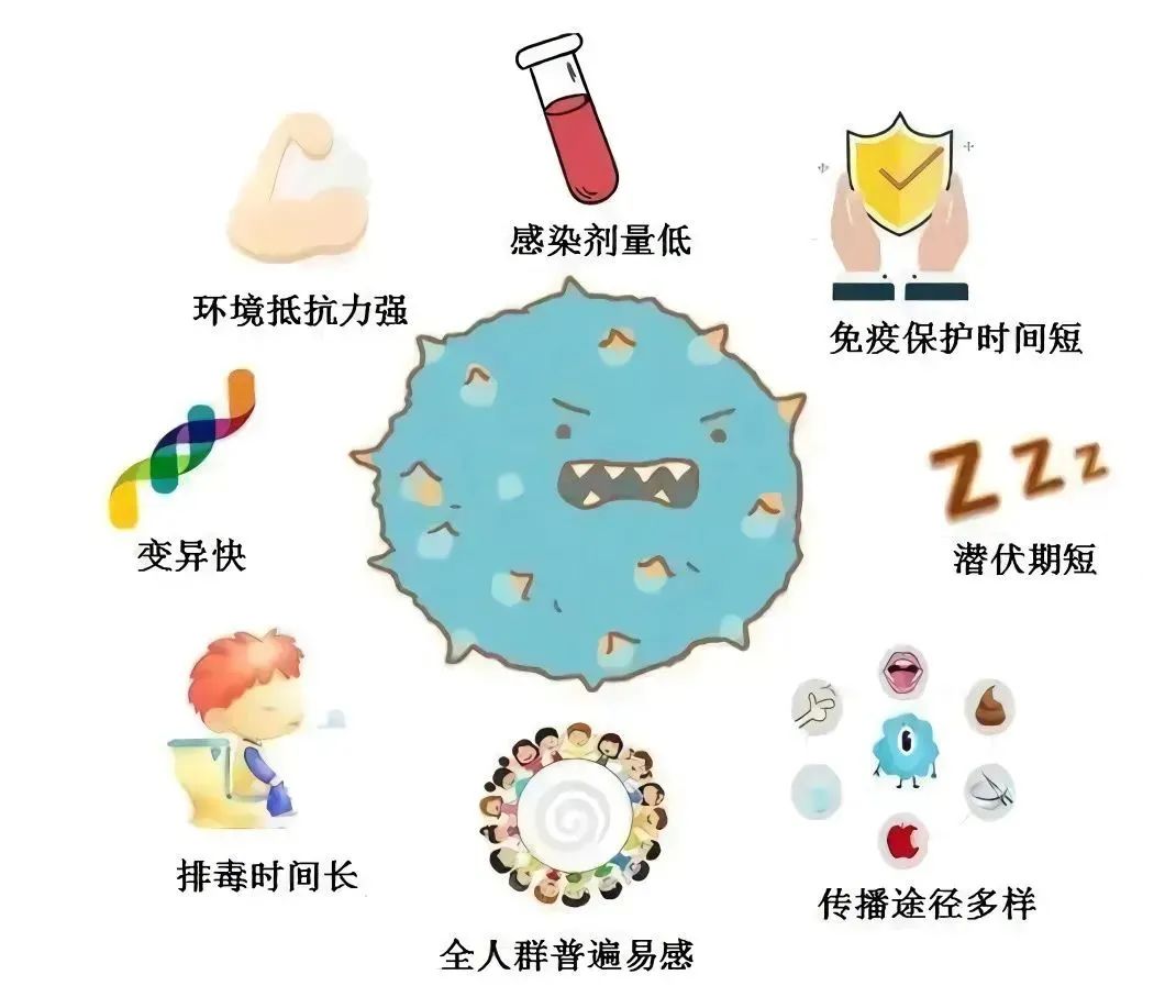 諾如病毒具有感染劑量低(低至18個病毒顆粒即可引起感染)、感染后潛伏期短(通常24-48小時)、排毒時間長(排毒高峰在發病后2-5天,持續約2-3周)、外環境抵抗力強(可在0-60℃溫度范圍內存活)、免疫保護時間短(感染后免疫保護持續6-24個月,同一個體可重復感染同一毒株或不同毒株的諾如病毒)等特點。
