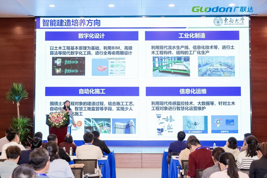 趨勢與變革環節,由中建一局北京公司技術質量部周冀偉總經理分享《智能建造關鍵技術研究及項目應用案例分析、人才需求與培養展望》;東南大學靳慧教授分享《智能建造機器人課程開發與實踐》;解構與重塑環節,廣聯達數字教育產品總監、廣聯達數字教育研究院院長樊志光分享了《智能建造專業內涵發展建設思考》;智能建造區域標桿院校案例解碼環節,北京工業職業技術學院建筑與測繪工程學院院長張麗麗《數字技術賦能智能建造專業群人才培養創新實踐》。